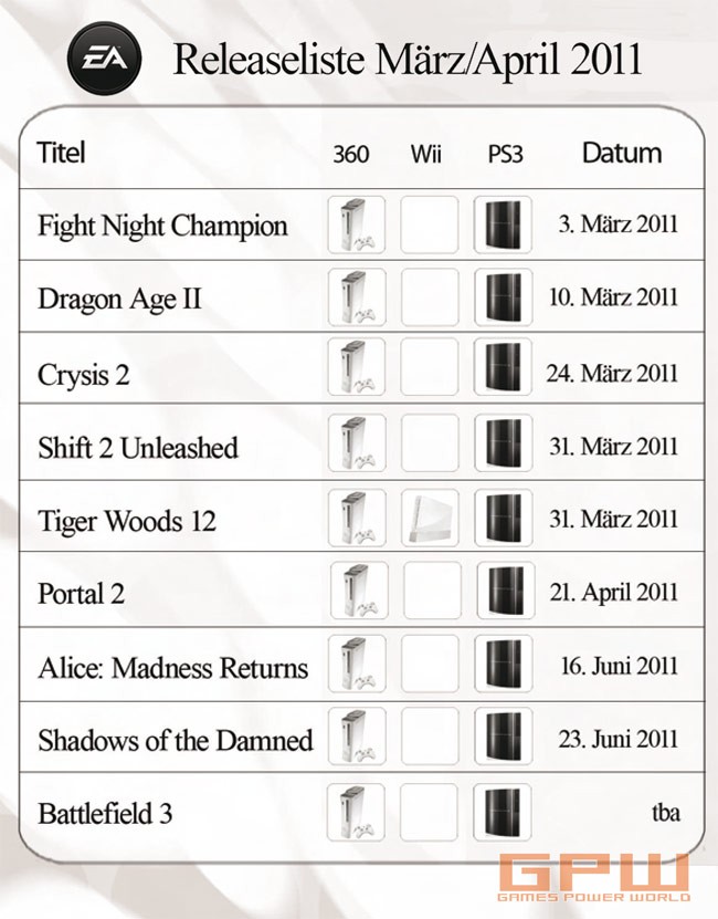 Electronic Arts-Releaseliste März/April 2011 Anbei senden wir Ihnen die aktuelle Releaseliste aus dem Hause ELECTRONIC ARTS für die Monate März/April 2011. Es sind alle Neuerscheinungen der nächsten Monate aufgelistet. Die Highlights im April: Portal 2 (PC, Mac, Xbox 360, PS3) Zwischen den „Tests“ der menschenverachtenden KI GlaDOS, entwickelt sich eine mitreißende Rahmenhandlung, die den Spieler mit neuen Charakteren, cineastischen Zwischensequenzen und einer kontextsensitiven Soundkulisse in eine neue Erfahrungsdimension teleportiert. Abseits der Solo-Kampagne bietet Portal 2 einen umfangreichen Koop-Modus mit komplett neuen Herausforderungen, in denen zwei charmante Roboter namens Atlas (blau) und P-body (orange) ihre Logikeinheiten verbinden müssen, um in den zahlreichen Portal-Rätseln nicht als Schraubensalat zu enden.