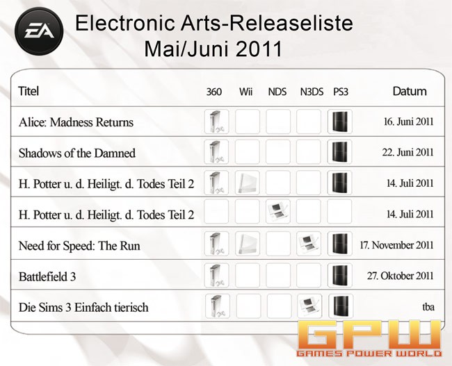 Electronic Arts-Releaseliste Mai/Juni 2011 Anbei senden wir Ihnen die aktuelle Releaseliste aus dem Hause ELECTRONIC ARTS für die Monate Mai/Juni 2011. Es sind alle Neuerscheinungen der nächsten Monate aufgelistet. Die Highlights im Juni: Alice: Madness Returns (PC, Xbox 360, PS3) Im Action-Adventure Alice: Madness Returns überschreitet der Spieler den Horizont seines Verstandes und gelangt an fantastische Orte, die fernab des Möglichen im surrealen Wunderland verborgen liegen. Zunächst bezaubernd und wunderschön kehren sich die märchenhaften Szenarien im zweiten Teil der Alice-Serie in einen dunklen und verzerrten Alptraum um. Ebenso abwechslungsreich wie die unheimlichen, düsteren und teilweise skurrilen Level gestalten sich die Waffen im Spiel. Alice schießt beispielsweise mit einer Pfeffermühle auf Schweineschnauzen, schnätzelt mit einem riesigen Küchenmesser durch Horden von Kartensoldaten oder zerfetzt die Fratzenmonster ihrer gestörten Psyche mit einem Teekannen-Mörser. Mit ihren magischen Fähigkeiten hüpft sie in Jump & Run – Einlagen auch in Doppel-und Dreifachsprüngen über tiefe Schluchten, gleitet durch die Luft und verändert sogar ihre Größe. In geschrumpfter Form zwängt sich Alice durch jedes Mauseloch und als Riese zerstampft sie ihre Feinde zu Brei. Neben der Action runden Musik-, Schach- und Puzzlerätsel dieses manische Abenteuer zu einem herausfordernden Spielerlebnis ab. Shadows of the Damned (Xbox 360, PS3)