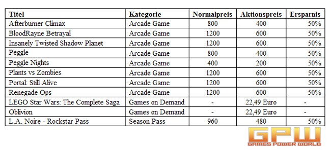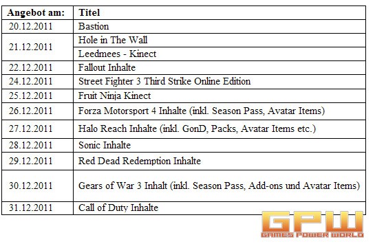 Xbox Live Aktionsangebote zum Jahresende Zum Jahresende lässt es Xbox noch einmal richtig krachen. Mit zahlreichen vergünstigten Xbox Live Angeboten wird ein erfolgreiches Jahr voller Spielehighlights und ausgezeichneter Entertainmentinhalte gefeiert. Ab sofort stehen bis zum 2. Januar die besten Angebote auf dem Xbox Live Markplatz zum Download bereit. Neben Games on Demand Klassikern warten aktuelle Arcade Games und Season Passes zum halben Preis auf alle Spieler. Zusätzlich gibt es bis zum 31. Dezember weitere ausgewählte Inhalte auf dem Xbox Live Markplatz, die für jeweils 24 Stunden zum Schnäppchenpreis erhältlich sind. Die Angebote gelten für alle Xbox Live Mitglieder und setzen keine Xbox Live Goldmitgliedschaft voraus. Folgende Angebote stehen ab sofort bis zum 2. Januar zum Aktionspreis bereit: Folgende Angebote stehen für jeweils 24 Stunden zum Aktionspreis bereit: