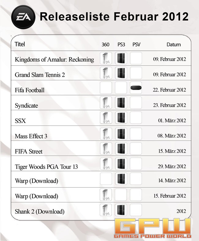 Anbei die aktuelle Releaseliste aus dem Hause ELECTRONIC ARTS für Januar 2012. Es sind alle Neuerscheinungen der nächsten Monate aufgelistet.