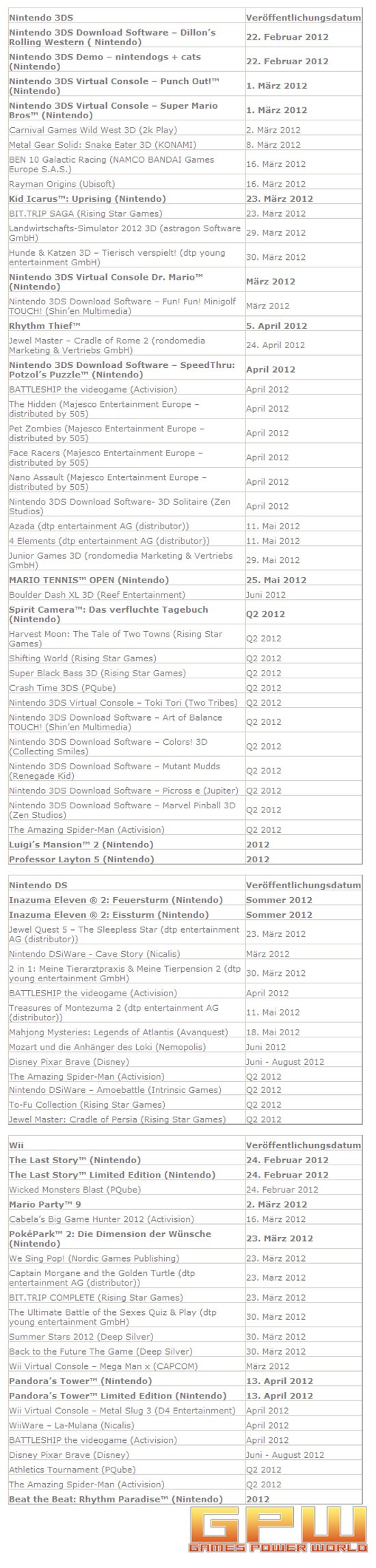 Nintendo kündigt umfangreiches Lineup neuer Spiele Neuheiten für Nintendo 3DS, Wii und Nintendo DS Ob alt, ob jung, ob Videospiel-Profi oder Einsteiger - für alle Besitzer der tragbaren Spielkonsolen Nintendo 3DS und Nintendo DS oder der TV-Konsole Wii hatte die aktuelle Ausgabe von Nintendo Direct etwas im Angebot. Wer diese verpasst hat und selber einen Blick auf die kommenden Spiele werfen möchte, wird jetzt auf der Webseite https://nintendodirect.nintendo.de von Nintendos Präsident Satoru Iwata persönlich informiert. Im Rahmen der gestrigen Online-Pressekonferenz Nintendo Direct stellten er und sein Team einige der wichtigsten Neuerscheinungen und Inhalte vor, mit denen Nintendo seine Fans in nächster Zeit überraschen wird. Wer darüber hinaus stets auf dem Laufenden bleiben will, kann exklusive Ankündigungen von Neuheiten und offizielle Mitteilungen des Unternehmens jetzt auch über den offiziellen Twitter-Feed @NintendoDeutsch verfolgen. Neues für Nintendo 3DS Die Fans von Super Mario dürften besonders erfreut darüber sein, dass der pfiffige Klempner und seine Freunde bald wieder einen sauberen Aufschlag hinlegen: in dem tempo- und actionreichen MARIO TENNIST OPEN, das am 25. Mai erscheint. Erstmals wird es in einem Spiel der Mario Tennis-Reihe möglich sein, sich mit seinen Freunden Online-Matches zu liefern. Wer gewinnt, sammelt nicht nur Punkte, sondern klettert auch auf der spielinternen Rangliste immer weiter nach oben. Für Mario-Freunde, die bis zum Start des Tennis-Spiels nicht warten können, gibt es weitere interessante Neuigkeiten. Zum einen hat Nintendo of Europe eine offizielle Community für alle Besitzer von Mario Kart 7 gestartet. Die Gruppe mit dem Code 44-9597-2178-5848 steht ab sofort allen Hobby-Rennfahrern offen. Zum anderen bietet Nintendo Jump'n'Run-Fans, die Super Mario 3D Land auf dem Nintendo 3DS spielen, zwei neue Videos an, mit denen sie überraschende Spieltechniken erlernen können. Die Videos lassen sich über die offizielle Webseite www.supermario3dland.de abrufen oder - natürlich in 3D - über den Nintendo eShop. Nach einer Vereinbarung zwischen SEGA und Nintendo of Europe, wird am 5. April mit Rhythm Thief & der Schatz des Kaisers ein weiterer exklusiver Nintendo 3DS-Titel erscheinen. Er versetzt die Spieler nach Paris, wo sie ein mit Rätseln gespicktes, musikalisches Abenteuer erleben. Nur wer dabei im Rhythmus bleibt und jede Menge Rätsel löst, wird das mysteriöse Verschwinden eines Meisterdiebs aufklären können. Besonders viel gibt es derzeit für Freunde von Kampfspielen zu entdecken. In der kürzlich gestarteten TEKKEN 3D PRIME EDITION für Nintendo 3DS erwartet sie nicht nur die klassische TEKKEN-Action. Das Spielmodul enthält außerdem den kompletten 3D-Film TEKKEN Blood Vengeance. Im Nintendo eShop finden die Besucher einen exklusiven 3D-Trailer des Films. Wer im neuen Resident Evil Revelations, etwa im kooperativen Modus des Spiels, mitten im Monster-Kampf steckt und ein wenig Unterstützung benötigt, sollte den Nintendo 3DS mit seinem integrierten Schrittzähler immer bei sich tragen. Denn je mehr Schritte er macht, desto mehr Spielmünzen landen auf seinem Konto, die er dann gegen bessere Waffen eintauschen kann. Damit nicht genug der Action, denn Fans des Genres dürfen sich auf einen neuen Titel der Serie Fire Emblem freuen. Er wird im Laufe dieses Jahres auf Nintendo 3DS starten, zusammen mit einer Reihe von Download-Inhalten, z.B. zusätzlichen Karten. In den kommenden Wochen wird eine Vielzahl weiterer Download-Neuheiten im Nintendo eShop erhältlich sein. Ab sofort steht zum Beispiel Dillon's Rolling WesternT zum Download bereit: In dem spannenden Action-Tower-Defence-Spiel schlüpfen die Spieler in die Rolle von Dillon, dem Gürteltier-Ranger, der Siedlungen im wilden Westen vor den Angriffen verfressener Felsmonster schützt. Dillons Abenteuer stellt die Nintendo 3DS-Spieler vor stetig wechselnde Aufgaben und Herausforderungen, je nach Tageszeit. Tagsüber, wenn die Grocks sich nicht blicken lassen, verstärken sie die Verteidigungsanlagen rund um die Siedlungen mit Wach- und Wehrtürmen. Es gilt, den Tag gut zu nutzen, die Wehrtürme reichlich mit Waffen zu bestücken, die Tore zu befestigen und für den Notfall eine letzte Verteidigungslinie aufzubauen. Denn sobald die Dämmerung hereinbricht, steigen die Grocks aus unterirdischen Felsspalten und Dillon bekommt endlich das Weiße in den Augen seiner Gegner zu sehen. Auch zu diesem Spiel gibt es im Nintendo eShop einen 3D-Trailer zu sehen. Wer es etwas niedlicher mag, liegt mit nintendogs + cats genau richtig. Eine Demo-Version dieses Nintendo-Bestsellers, in dem die Spieler sich mit süßen Hundewelpen und Kätzchen beschäftigen, steht ebenfalls im Online-Shop bereit. Auch sonst lohnt es sich, dort immer wieder einmal vorbeizuschauen. Ab März erscheinen beispielsweise erstmals Titel des SEGA Game Gear auf Nintendo 3DS - als Teil des Spieleprogramms für die Virtual Console. Im 2. Quartal 2012 wird das Entwickler-Team der bekannten Project Zero-Serie für gepflegten Horror auf Nintendo 3DS sorgen: Spirit Camera: Das verfluchte Tagebuch nutzt alle Features der innovativen Konsole, um den Spielern eine Gänsehaut über den Rücken zu jagen. In das Spiel integriert ist ein 16-seitiges AR-Notizbuch, das "Purple Diary". In ihm erscheinen gespenstische Bilder, mit denen die Spieler auf völlig neue Art interagieren können. Was gibt's Neues für Wii? Doch auch auf die Rollenspieler unter den Wii-Fans wartet ein neues Abenteuer: Am 13. April erscheint eine limitierte Edition von Pandora's Tower exklusiv für Wii. In ein edles Steelbook gehüllt, enthält sie außer dem Spiel ein 32-seitiges Booklet mit den besten Grafiken dieses Titels. Kurz nach The Last Story startet mit Pandora's Tower somit ein weiteres spannendes und handlungsreiches Rollenspiel für Wii. Es glänzt mit Echtzeit-Kämpfen, Bewegungssteuerung, dynamischen, veränderbaren Beziehungen zwischen d