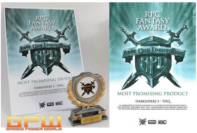 Darksiders II gewinnt den RPC Fantasy Award / Am vergangenen Wochenende fand in Köln mit der Role Play Convention 2012 die spektakuläre Messe für Rollenspiel-Fans statt. Die Fantasy-Messe bot den Besuchern auch in diesem Jahr hochinteressante Shows und Ausstellungen rund ums Thema Rollenspiel. Eine wichtiger Programmpunkt war erneut die Verleihung des RPC Fantasy Awards. Der Preis deckt alle fantastischen Genres ab, bewertet Produkte aus dem Vor- sowie dem laufenden Jahr und zeichnet laut Veranstalter die Spiele aus, “mit denen außergewöhnliche Momente erlebt werden können“. Das Action-Adventure Darksiders II räumt hier den RPC Fantasy Award in der Kategorie “Most Promising Product” ab! THQ und Vigil Games freuen sich riesig über die Auszeichnung und danken der Jury für das gezeigte Vertrauen in die Entwicklung und Qualität von Darksiders II.