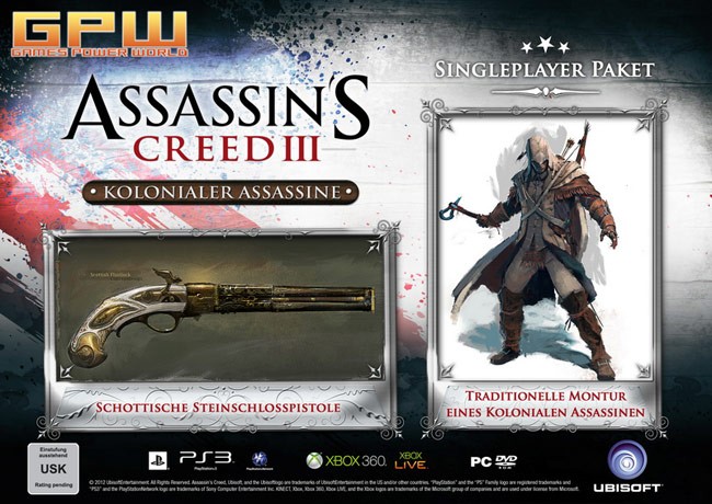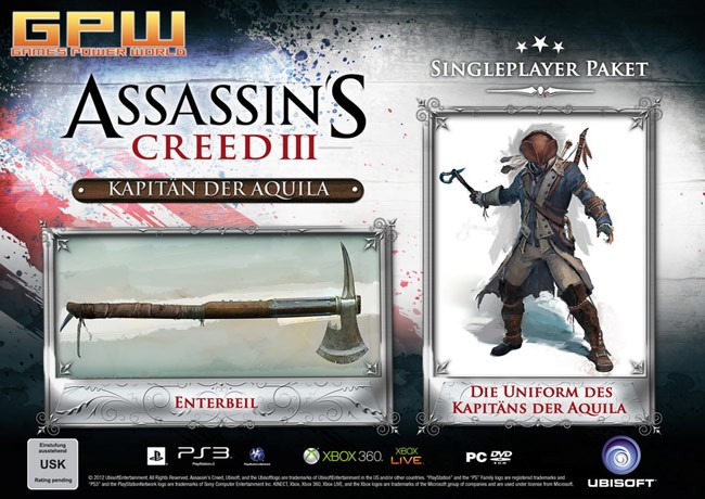 Assassin’s Creed III: UbiSoft stellt Vorbesteller-Boni vor Düsseldorf, 24. Mai 2012 – Ubisoft stellte heute die Boni vor, die Vorbesteller von Assassin’s Creed III erhalten. Insgesamt stehen drei verschiedene Vorbesteller-Pakete zur Auswahl. Kolonialer Assassine Kapitän der Aquila Rotrock Vor dem Hintergrund der Amerikanischen Revolution im späten 18. Jahrhundert präsentiert Assassin’s Creed III einen neuen Helden: Ratohnhaké:ton, der teils uramerikanischer, teils englischer Abstammung ist. Er nennt sich selbst Connor und wird die neue Stimme der Gerechtigkeit im uralten Krieg zwischen Assassinen und Templern. Der Spieler wird zum Assassinen im Krieg um Freiheit und gegen Tyrannei in der aufwändigsten und flüssigsten Kampferfahrung der Reihe. Assassin’s Creed III umfasst die Amerikanische Revolution und nimmt den Spieler mit auf eine Reise durch das lebhafte, ungezähmte Grenzland, vorbei an geschäftigen Kolonialstädten, bis hin zu den erbittert umkämpften und chaotischen Schlachtfeldern, auf denen George Washingtons Kontinentalarmee mit der eindrucksvollen Britischen Armee zusammenstieß. Assassin’s Creed III wird am 31. Oktober 2012 für die Xbox 360®, PlayStation®3 und Windows PC veröffentlicht. Assassin’s Creed III ist außerdem für die Wii U™ von Nintendo in der Entwicklung. Für weitere Informationen besuchen Sie die offizielle Website: www.assassinscreed.com und facebook.com/assassinscreed Eine komplette Übersicht über alle erhältlichen Versionen und Vorbesteller-Angebote von Assassin’s Creed III finden Sie unter www.assassinscreed.com/preorder