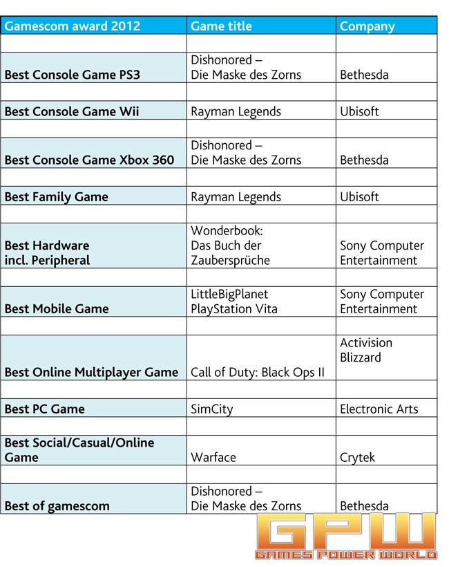 Sie sind die begehrtesten Preise der europäischen Spiele-Industrie und Auszeichnung für herausragende Soft- und Hardware: die gamescom awards. Mehr als 275.000 Besucher erlebten in der vergangenen Woche in Köln die spektakulären Neuheiten der gamescom 2012. Darunter waren auch die 20 internationalen Juroren und Experten der weltweit führenden Spielemedien, die die gamescom award Jury 2012 bildeten. Und diese Jury hat aus mehr als 100 Einreichungen die besten Spiele- und Hardware der diesjährigen gamescom 2012 ausgezeichnet. And the winners are: Bethesda, Sony Computer Entertainment, Ubisoft, Electronic Arts, Activision Blizzard und Crytec mit ihren Innovationen. Gleich drei Preise, unter anderem den Best of gamescom award 2012, gewinnt die Firma Bethesda mit ihrem Hit: "Dishonored - Die Maske des Zorns" (Best of gamescom, Best Console Game für PS3 + Xbox 360). Das beste Konsolenspiel für die Wii und das Beste Family Game der Messe ist nach Ansicht der Jury "Rayman Legends" von Ubisoft. Sony Computer Entertainment verzaubert mit dem "Wonderbook: Das Buch der Zaubersprüche" nicht nur die Spieler, sondern auch die Jury und wird für die beste Hardware incl. Peripheral prämiert. Mit "Little Big Planet" für die PlayStation Vita geht auch der Preis für das Beste Mobile Game der gamescom 2012 an Sony. Als bestes Online Multiplayer Game der Messe wird "Call of Duty: Black Ops II" von Activision Blizzard ausgezeichnet. Der Preis für das beste PC-Spiel geht an Electronic Arts mit "SimCity". Das beste Social/Casual/Online Game ist Warface von Crytec, welches die gamescom awards 2012 abrundet. In der Laudatio für die Gewinner stellt die Jury folgendes heraus: