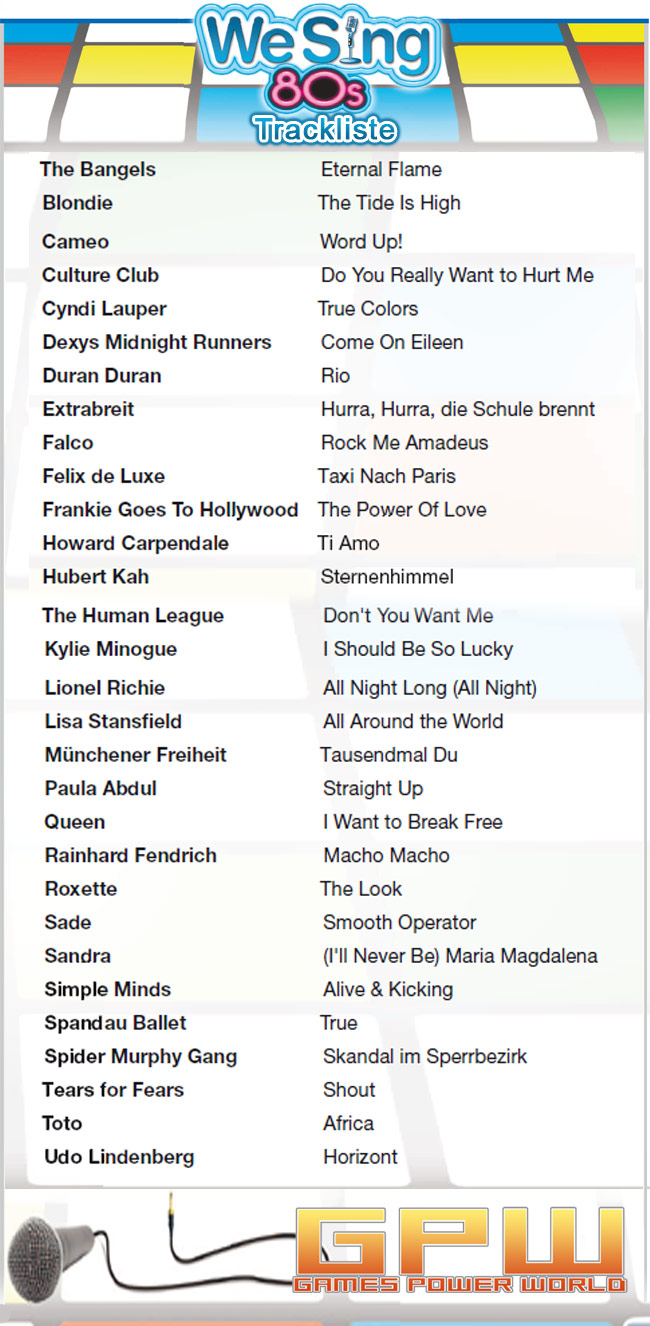Die 80er sind zurück! Hamburg, 12. Oktober 2012 – Spätestens jetzt sollten Schulterpolster, Stulpen und Dauerwelle wieder in Form sein, denn heute ist es endlich so weit: Nordic Games veröffentlicht We Sing 80s und bringt dieses unvergessliche Jahrzehnt zurück ins Wohnzimmer. Musiklegenden wie Queen, Blondie oder Kylie Minogue drücken sich hier die Klinke in die Hand und garantieren mit ihren Hits jedem Karaokehelden einen unvergesslichen Auftritt! Egal ob Cyndi Laupers Hit “True Colors” oder Cameos “Word Up” – wer mit We Sing 80s zum Mikrofon greift, darf in Erinnerungen schwelgen und sich gemeinsam mit den ganz Großen der 80er an diese unglaubliche Zeit erinnern. Nachdem in einer spannenden Facebook-Aktion Tag für Tag alle Titel der grandiosen Trackliste bekannt geben wurde, können jetzt endlich alle Fans gepflegter Karaoke-Unterhaltung selbst loslegen und gemeinsam mit Freunden und Familie das Wohnzimmer rocken. We Sing 80s wartet mit insgesamt 30 unvergessenen Kulthits der 80er zusammen mit ihren Original-Musikvideos auf. Jeder der Songs hat dabei seine eigene Schwierigkeitsstufe und kann von bis zu vier Spielern gleichzeitig gesungen werden. Dem Spaß für die ganze Familie steht also nichts im Wege! We Sing 80s ist exklusiv für Nintendo Wii erhältlich und erscheint heute im Vertrieb der Flashpoint AG sowohl als Bundle mit zwei Logitech-Mikrofonen als auch als Standalone-Version ohne Mikrofone. Weitere Informationen gibt es im Internet auf www.wesinggame.com/de, via Twitter auf www.twitter.com/WeSingGame sowie auf der Facebook-Seite von We Sing www.facebook.com/wesingDE.