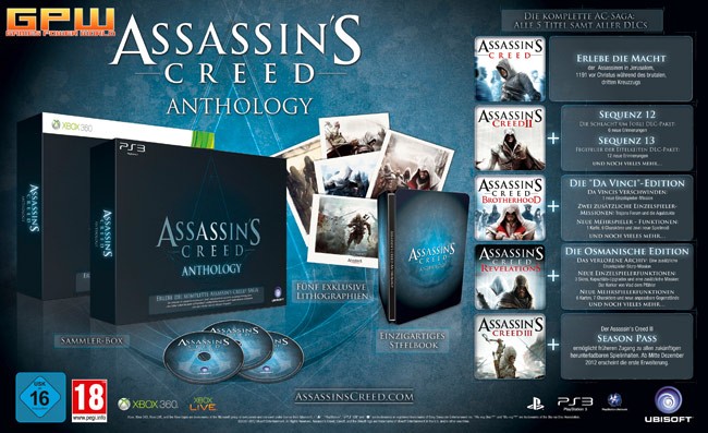 Düsseldorf, 7. November 2012 – Ubisoft kündigte heute die Assassin’s Creed Anthology an, eine einzigartige Sammlung, die alle bisher erschienenen Assassin’s Creed-Titel enthält. Die Assassin’s Creed Anthology erscheint am 29. November 2012 für das Xbox 360® Videospiel- und Entertainment-System von Microsoft und das PlayStation®3 Computer-Entertainment-System zu einer unverbindlichen Preisempfehlung von 149,95€ und ist exklusiv bei Amazon erhältlich.