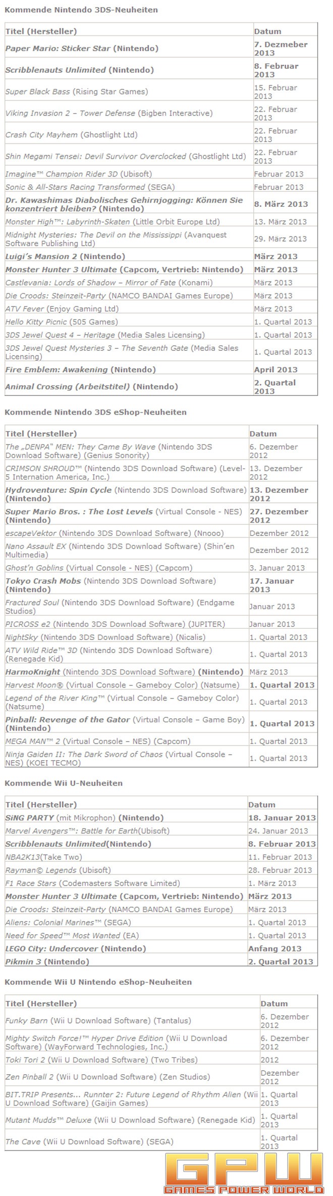 Nintendo: Spannende Aussichten für 2013 Kaum ist Wii U, die neue TV-Konsole von Nintendo, in Deutschland erschienen, da warten schon die nächsten Highlights auf die Videospiel-Fans. Noch vor Weihnachten kommen fantastische, neue Titel für Wii U, Nintendo 3DS und Nintendo 3DS XL auf den Markt. Und Anfang 2013 startet das neue Jahr furios. Ob die Nintendo-Fans für tragbare oder TV-gebundene Spiele schwärmen - die nächsten Monate werden für sie alle ein Fest, das garantiert für jeden Geschmack das Richtige zu bieten hat. Neuheiten für Wii U Anfang 2013 feiert zudem LEGO City: Undercover sein Debüt auf Wii U. Als Super-Cop Chase Mc-Cain müssen die Spieler wilde Verfolgungsjagden überstehen, sich geschickt verkleiden und die einzigartigen Funktionen des GamePads benutzen, um eine riesige, offene Spielwelt nach Hinweisen zu durchsuchen. Um einen Blick in die fernere Zukunft zu werfen, genügt ein Stichwort: Pikmin. Pikmin 3 wird im 2. Quartal 2013 in den Handel kommen. Spiele für Wii U und Nintendo 3DS In Scribblenauts Unlimited schlüpfen die Spieler in die Rolle des beliebten Helden Maxwell. Sie können ihrer Fantasie völlig freien Lauf lassen, wenn sie mit Hilfe des Gegenstandsgenerators immer neue Objekte erschaffen und festlegen, wie sich diese in der Spielwelt verhalten sollen. Zudem gilt es, auf einer Reise durch eine neue, völlig offene Welt, kreative Lösungen für knifflige Rätsel und Puzzles zu finden. In der Wii U-Version des Titels stoßen die Spieler immer wieder auf Figuren und Gegenstände aus dem Nintendo-Universum, etwa aus der Mario- oder der Zelda-Serie. Neues für die Fans des Nintendo 3DS Auch die Fans von Marios Bruder Luigi müssen sich nicht mehr allzu lange gedulden: In Luigi's Mansion 2 wird er ab März als Geisterjäger unterwegs sein. Ausgerüstet mit seinem zuverlässigen Gespenstersauger "Schreckweg 08/16" muss er Spukhäuser von unwillkommenen Bewohnern befreien und nebenher ein paar unheimlich vertrackte Rätsel lösen. Am 8. März gibt es ein Wiedersehen mit einem alten Bekannten in Dr. Kawashimas Diabolisches Gehirn-Jogging: Können Sie konzentriert bleiben? In diesem neuen Gehirn-Jogging-Titel hat der Doktor seine bisher härtesten Kopfnüsse versammelt. Es geht vor allem darum, die Konzentrationsfähigkeit zu verbessern. Das kann in einer Welt voller Ablenkungen ja nur von Nutzen sein. Zwei Spiele, die in Japan bereits sehr erfolgreich gestartet sind, werden im 2. Quartal 2013 auch in Deutschland erscheinen: Animal Crossing (Arbeitstitel) für Nintendo 3DS sowie Fire Emblem: Awakening. Neben den eigenen Spielen von Nintendo stehen viele weitere Titel in den Startlöchern, die von den verschiedenen Publishern für Wii U und Nintendo 3DS veröffentlicht werden. Einige davon werden im Handel, andere online im Nintendo eShop erhältlich sein. In den nächsten Monaten kommen so viele Neuheiten auf die Nintendo-Fans zu, da lohnt es sich in jedem Fall, die Augen offen zu halten. Weitere Informationen zu Nintendo finden sich im Internet für Twitter-Nutzer unter @NintendoDE oder über den offiziellen Nintendo Deutschland YouTube-Kanal unter www.youtube.com/NintendoDeutschland