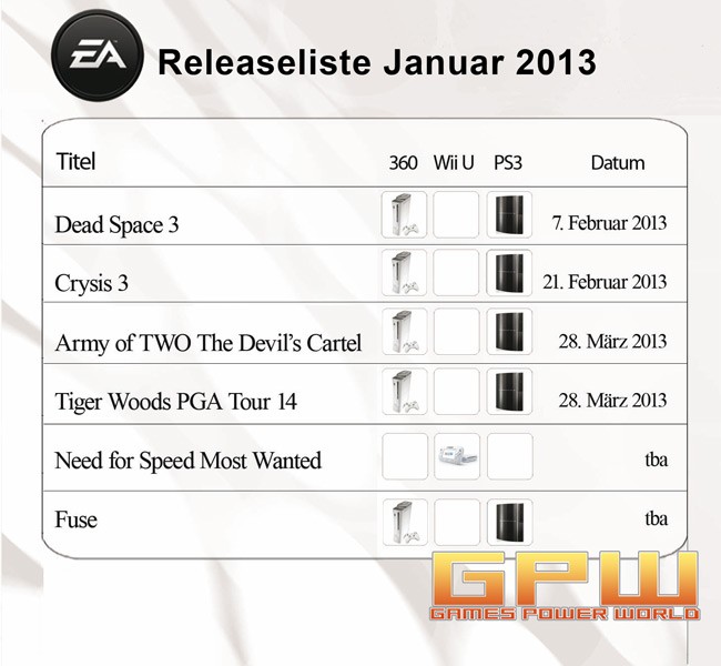Anbei die aktuelle Releaseliste aus dem Hause ELECTRONIC ARTS für Januar 2013. Es sind alle Neuerscheinungen der kommenden Monate aufgelistet.