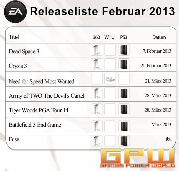 Anbei die aktuelle Releaseliste aus dem Hause ELECTRONIC ARTS für Februar 2013. Es sind alle Neuerscheinungen der nächsten Monate aufgelistet.