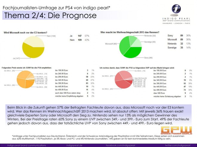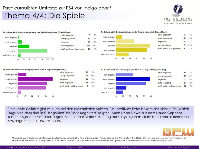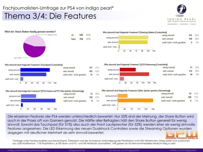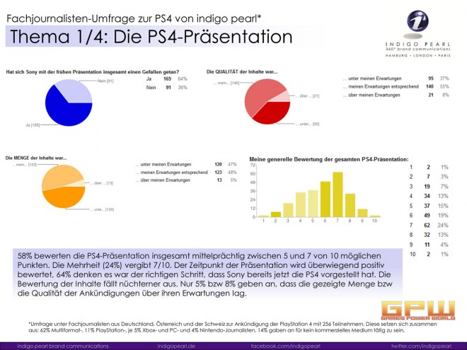 PS4-Präsentation: Ergebnisse einer Umfrage unter Fachmedien Die in der Nacht vom 20.02. auf den 21.02.2013 abgehaltene Präsentation von Sony zum Thema PlayStation 4 wurde sehr unterschiedlich aufgenommen. indigo pearl brand communications (www.indigopearl.de) hat eine anonyme und unabhängige Online-Umfrage unter Fachleuten der deutschen Gaming- und Hardware-Medien durchgeführt. Über 250 Fachleute haben an der Umfrage zur SONY PS4-Präsentation teilgenommen. Auf den folgenden Bildern findet ihr die Ergebnisse der Umfrage