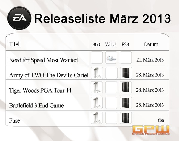 Anbei die aktuelle Releaseliste aus dem Hause ELECTRONIC ARTS für März 2013. Es sind alle Neuerscheinungen der nächsten Monate aufgelistet.