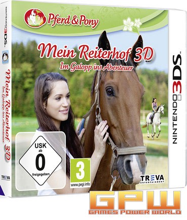 Key Features • 13 Minigames inkl. Kipp- und Bewegungssteuerung: Longieren, Hindernisparcours, berittenes Bogenschießen u.v.m. • Neue Minispiele mit Fokus auf die Gesundheit der Pferde: Hautbehandlungen und Massagen • Große Gestaltungsvielfalt des eigenen Pferdes: 26 Rassen (z.B. Haflinger, Lipizzaner u.v.m.), Geschlecht, Fellfarbe, Mähne u.a. • Augmented Reality-Feature: das virtuelle Pferd in die Realität übertragen • StreetPass™-Funktion: Ergebnisse mit Freunden teilen und tolle Extras freischalten Das Nintendo 3DS-Spiel „Mein Reiterhof 3D – Im Galopp ins Abenteuer“ ist ab sofort für 39,99 Euro im Handel erhältlich. Entwickelt wurde es von Artefacts Studio aus Lyon, Frankreich.