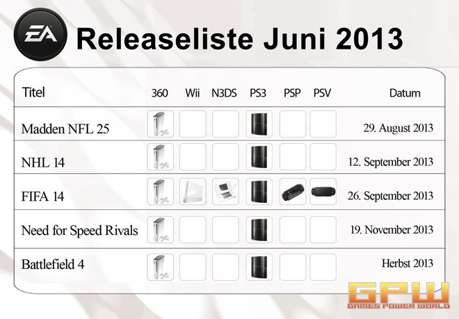 Anbei die aktuelle Releaseliste aus dem Hause ELECTRONIC ARTS für Juni 2013. Es sind alle Neuerscheinungen der nächsten Monate aufgelistet.