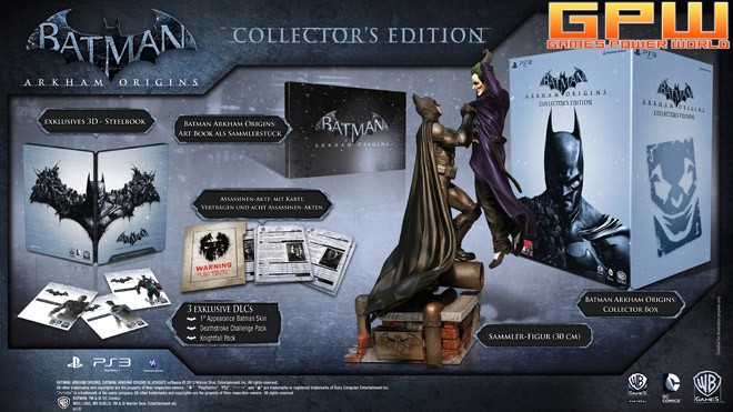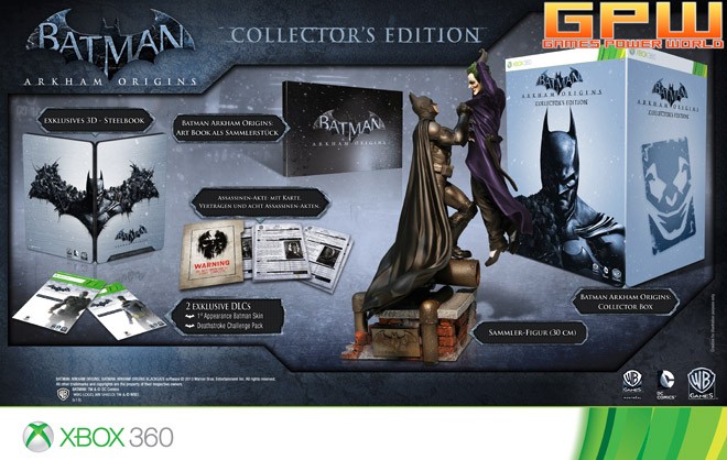 Batman: Arkham Origins - Details zur europäischen Collector's Edition Warner Bros. Interactive Entertainment und DC Entertainment geben heute erste Details zur europäischen Collector's Edition von Batman: Arkham Origins bekannt, welche am 25. Oktober 2013 in limitierter Auflage für Xbox 360 und PS3 zu einem UVP von 99,99 Euro erhältlich sein wird. Die Collector's Edition von Batman: Arkham Origins enthält den folgenden exklusiven Inhalt: