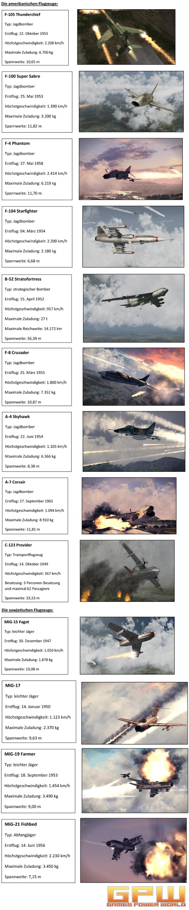 Air Conflicts: Vietnam In Air Conflicts: Vietnam dreht sich alles um Flugzeuge und Helikopter. Heute stellen wir euch die Flugzeuge vor, die ihr in Air Conflicts: Vietnam fliegen könnt. In der Singleplayer-Kampagne werdet ihr im Cockpit der amerikanischen Flieger Platz nehmen. Im Multiplayer sowie im Spielmodus „Schneller Kampf“ könnt ihr mit allen Maschinen antreten und zeigen, dass ihr der König des Himmels seid.