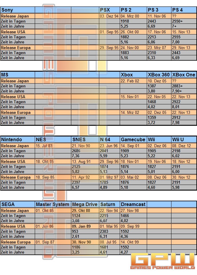 Hier könnt ihr mal sehen wie lange Konsolen (von Nintendo NES bis PlayStation 4) auf den Markt waren bevor die Nachfolgekonsole kam. Hier fehlen natürlich einige Konsolen und Hardwareerweiterungen wie z.B. Atari 2600, Atari 5200, Neo Geo usw. Und z.B. SEGA hatte für das SEGA Mega Drive noch 2 Hardwareerweiterungen das SEGA MEGA-CD und SEAGA 32X. >> Hier gibt es eine Liste von Konsolen und Handheld-Konsolen <<