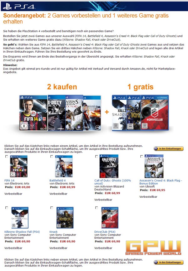 Edit 3: Die Aktion ist wieder da aber nur Exklusiv für die PlayStation 4-Vorbesteller von Amazon Sonderangebot: 2 Games vorbestellen und 1 weiteres Game gratis erhalten Sie haben die PlayStation 4 vorbestellt und benötigen noch ein passendes Game?