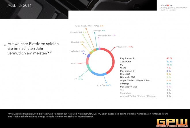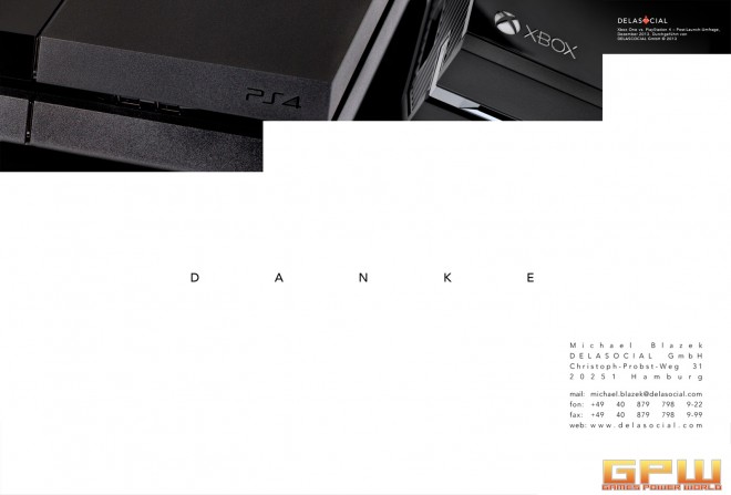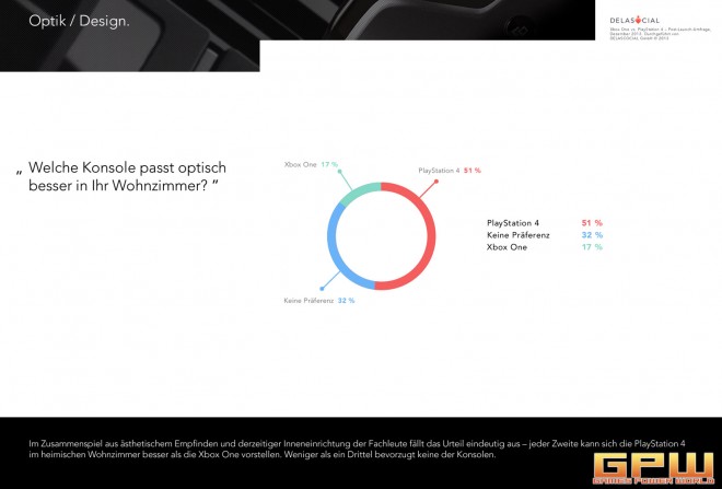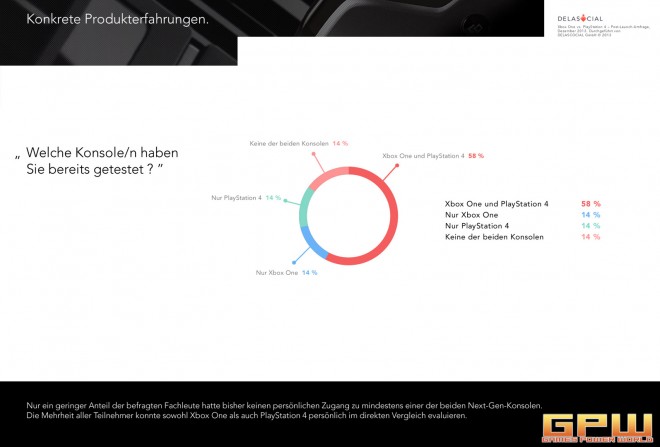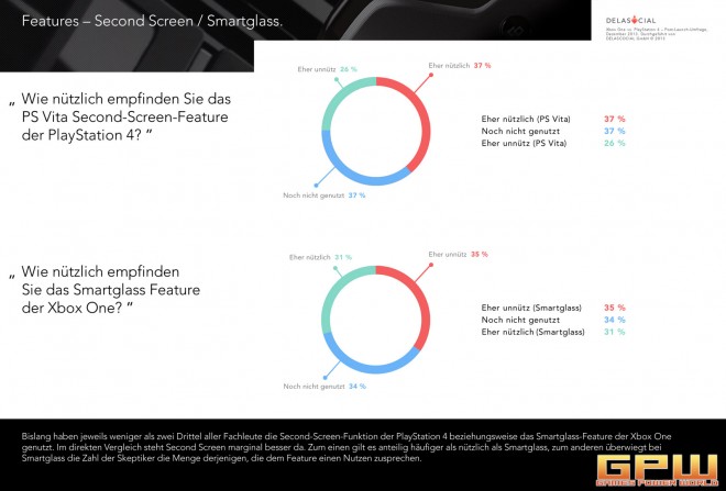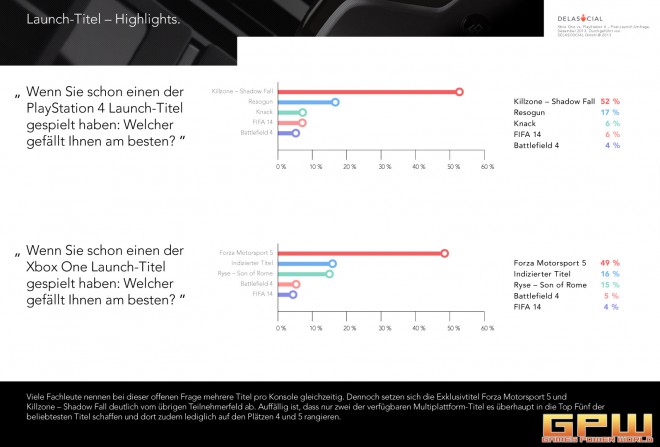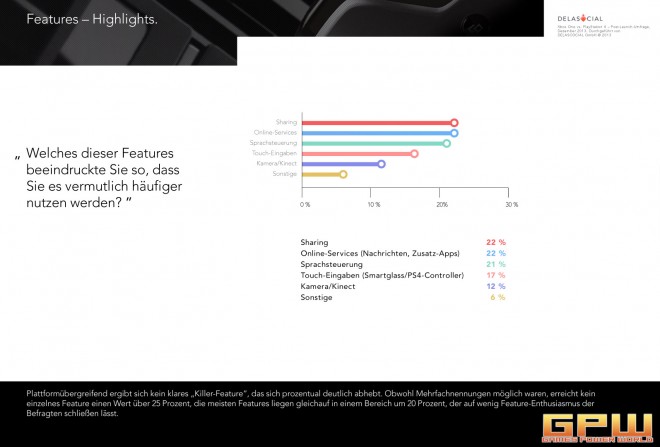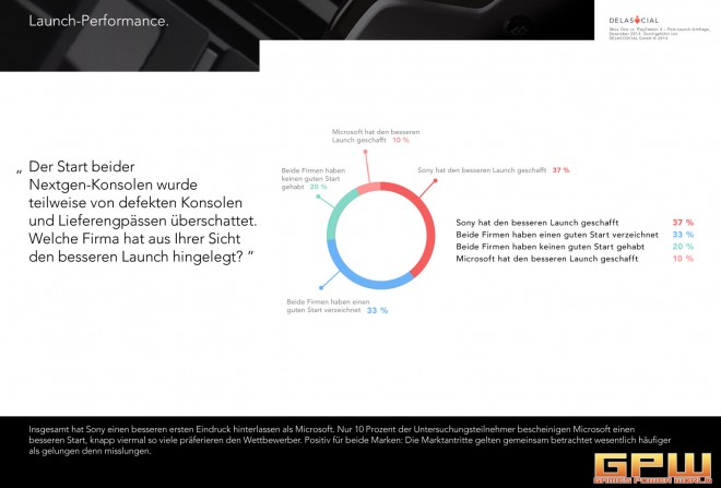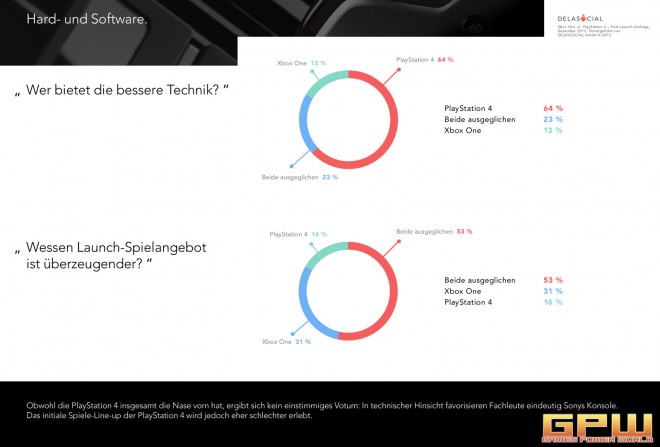 Ergebnisse der Umfrage zu den Next-Gen-Konsolen Hamburg, 16. Dezember 2013 - Passend zum Europa-Marktstart der neuen Konsolen PlayStation 4 von Sony und Xbox One von Microsoft führte die Hamburger Agentur DELASOCIAL kürzlich eine Umfrage unter Fachmedien der Videospiele- und Unterhaltungsbranche durch. Das Votum der 128 Journalisten fiel dabei deutlich aus. Mit Ausnahme des Spiele-Angebots zum jeweiligen Konsolenstart lag die PlayStation 4 der Umfrage von DELASOCIAL zufolge in allen Belangen in der Gunst des Fachpublikums vorne. Immerhin war für 31 Prozent der Umfrage-Teilnehmer das Spiele-Line-up zum Verkaufsstart auf der Xbox One überzeugender, nur 16 Prozent votierten für die PlayStation 4, und 53 Prozent konnten keinen gravierenden Unterschied ausmachen. Ein wirkliches „Killer-Feature“ ließ sich dem Eindruck der Journalisten nach hingegen bei keinem der beiden Next-Generation-Konsolen finden. Als „eher unnütz“ betrachteten 26 Prozent das Second-Screen-Feature, bestehend aus der Verbindung der PlayStation Vita mit der PlayStation 4. Noch deutlicher war die Ablehnung von SmartGlass auf der Xbox One, welchem nur 31 Prozent der Fachleute einen Mehrwert abgewinnen konnten. Obwohl Mehrfachnennungen möglich waren, erreichte bei der Frage nach dem beeindruckendsten Feature, beispielsweise dem Online-Sharing der PlayStation 4 oder Kinect auf der Xbox One, keine Antwortmöglichkeit einen Wert über 25 Prozent. Die meisten Features lagen gleichauf in einem Bereich um 20 Prozent, der auf wenig Enthusiasmus der Befragten hinsichtlich der markantesten Features schließen lässt.