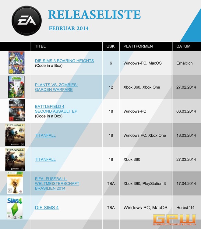Anbei die aktuelle Releaseliste aus dem Hause Electronic Arts für Februar 2014. Es sind alle Neuerscheinungen der nächsten Monate aufgelistet.