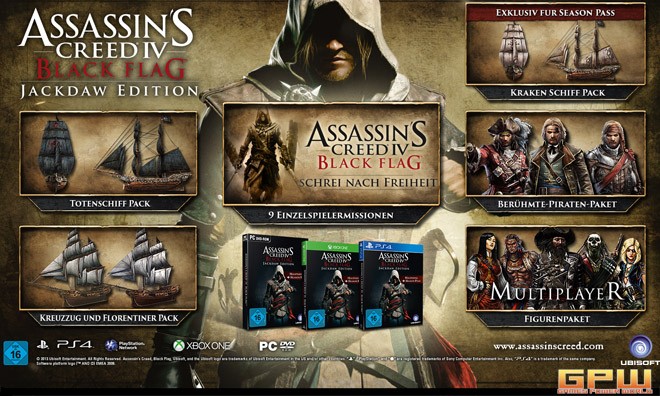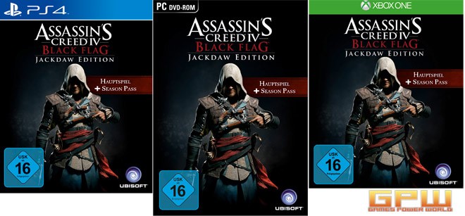Assassin’s Creed IV Black Flag Jackdaw Edition angekündigt Die Jackdaw Edition wartet neben dem Assassin’s Creed IV Black Flag-Spiel mit sieben zusätzlichen DLCs auf Düsseldorf, 10. März 2014 – Ubisoft® kündigte heute an, dass die Assassin’s Creed® IV Black Flag™ Jackdaw Edition am 27. März für das PlayStation® 4 Computer Entertainment System, für Xbox One, dem All-in-One Games und Entertainment System von Microsoft sowie den Windows PC erscheinen wird. Die Assassin’s Creed® IV Black Flag™ Jackdaw Edition beinhaltet: Assassin’s Creed® IV Black Flag™ inklusive folgender herunterladbarer Inhalte: Totenschiff-Paket – Segel, Galionsfigur und Steuerrad bekommen ein neues, furchterregendes Gewand. Krakenschiff-Paket – Inspiriert vom legendären Seeungeheuer, das fähig ist, Schiffe, Menschen und Wale gleichermaßen zu verschlucken, kann der Spieler seinem Schiff ein neues Aussehen verleihen. Kreuzzug- & Florentiner-Paket – Der Spieler kann sein Schiff in den Farben von Altaïr oder Ezio erstrahlen lassen. Das Paket beinhaltet darüber hinaus vier personalisierbare Gegenstände sowie zwei neue Waffen für Edward. Berühmte-Piraten-Paket – Dieses Paket beinhaltet drei neue Inseln, die zum entdecken einladen und viele versteckte Schätze bergen. Das Paket wartet außerdem mit neuen Outfits, Waffen und Schiffszubehör auf. Der Spieler kann darüber hinaus seine Multiplayer-Erfahrung mit neuen Skins und Gegenständen aufwerten. Multiplayer DLC #1 –Blackbeards Zorn – Die Multiplayer-Erfahrung wird mit diesem DLC um drei furchterregende neue Charaktere, den Jaguar, die Orchidee und Blackbeard höchstpersönlich, bereichert. Multiplayer DLC #2 – Halunken-Gilde – Die Sirene, der blinde Passagier und der Schamane schließen sich der Jagd an. Außerdem bietet das Paket neue Anpassungsoptionen und Moves. Assassin’s Creed® IV Black Flag™ Schrei nach Freiheit – Schrei nach Freiheit beinhaltet neun Missionen mit einer in sich geschlossenen Geschichte, bei dem die Spieler Adéwalé steuern, den ersten Offizier von Edward Kenway. Adéwalé, der als Sklave geboren wurde, fand seine Freiheit als Pirat auf der Jackdaw und ist die rechte Hand von Kapitän Edward Kenway. Fünfzehn Jahre später ist Adéwalé ein ausgebildeter Assassine. Gestrandet auf Saint-Domingue ohne Waffen und ohne Crew, beginnt er sein eigenes Abenteuer.