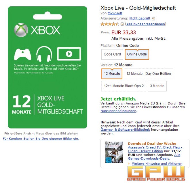 12 Monate XBox Live Gold für 33,33 Euro Jetzt ist ein sehr guter Zeitpunkt, um sich die XBox Live Goldmitgliedschaft (für XBox 360 und XBox One) für 12 Monate zu kaufen, den jetzt kosten die 12 Monate nur 33,33 Euro.