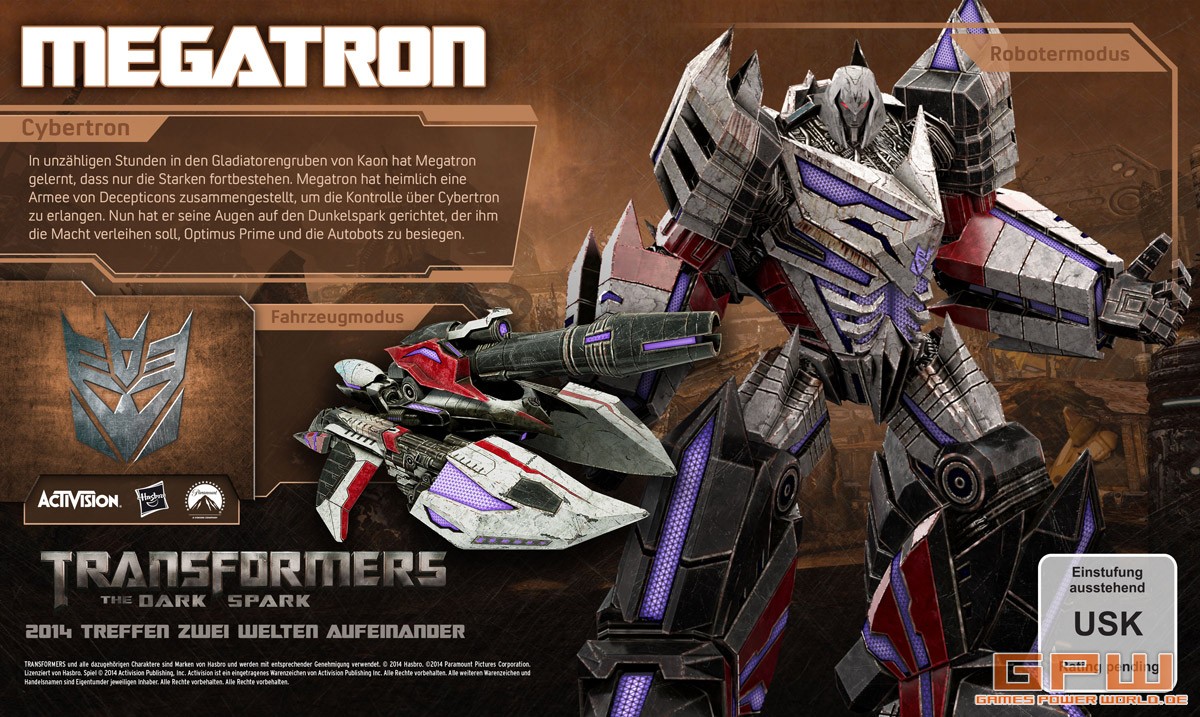 Megatron aus Transformers: The Dark Spark im Portrait München – 29. April 2014 – Activision Publishing, Inc. und Hasbro, Inc. veröffentlichen neue Bilder von Megatron, dem Anführer der Decepticons aus dem Spiel Transformers™: The Dark Spark™. Der Titel komplementiert den Paramount Pictures-Film Transformers: Ära des Untergangs, der im Juli 2014 in deutschen Kinos anläuft. Die Bilder gibt es wie immer hier --> Unzählige Stunden in den Gladiatorengruben von Kaon haben Megatron gelehrt, dass nur die Starken fortbestehen. Megatron hat heimlich eine Armee von Decepticons zusammengestellt, um die Kontrolle über Cybertron zu erlangen. Nun hat er seine Augen auf den Dunkelspark gerichtet, der ihm die Macht verleihen soll, Optimus Prime und die Autobots zu besiegen. Transformers: The Dark Spark erscheint für Xbox One, PlayStation®4, Xbox 360, PlayStation®3, Nintendo Wii U™, Nintendo 3DS™ und Windows PC. Transformers: The Dark Spark ist von der USK noch nicht eingestuft worden. Die neuesten Informationen zum Spiel finde sich unter www.transformersgame.com.