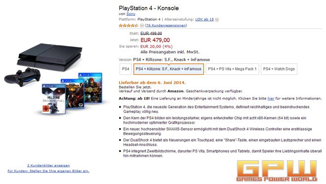 Amazon PlayStation 4-Paket - Angebot Die PlayStation 4 + Killzone Shadow Fall + inFamous Second Son + Knack für nur 479,00 Euro