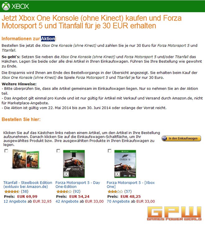 Informationen zur Aktion: So geht's: Setzen Sie neben die Xbox One Konsole (ohne Kinect) und Forza Motorsport 5 und/oder Titanfall das Häkchen. Legen Sie beide oder alle drei Artikel in Ihren Einkaufswagen. Führen Sie Ihre Bestellung wie gewohnt zu Ende. Die Ersparnis wird Ihnen am Ende des Bestellvorgangs in der Übersicht angezeigt. Sie erhalten beim Kauf der Xbox One Konsole (ohne Kinect) die Spiele Forza Motorsport 5 und Titanfall je für nur 30 Euro. Weitere Hinweise: