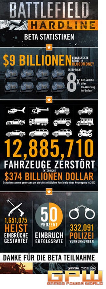 Beta-Tester erbeuten neun Billionen US-Dollar in Battlefield Hardline Köln, 09. Juli 2014 – Vom 9. bis 26. Juni 2014 hatten Battlefield Fans weltweit Gelegenheit, im Rahmen einer Betaphase den Mehrspieler-Modus des neuen Battlefield Hardline kennenzulernen. Dass sie dabei nicht untätig waren und diese Möglichkeit intensiv genutzt haben, zeigen Statistiken, die Electronic Arts heute in Form einer Infografik veröffentlicht. So wurden bei virtuellen Banküberfällen im Blood Money-Modus über neun Billionen US-Dollar erbeutet, was etwa der achtfachen Menge der sich tatsächlich im Umlauf befinden Geldmenge in den USA entspricht, und etwa 13 Millionen Fahrzeuge mit einem Gesamtwert von 374 Billionen US-Dollar zerstört. Im Heist-Modus initiierten die Spieler etwas mehr als 1,6 Millionen Einbrüche, von denen die Polizei exakt die Hälfte vereiteln konnte und nicht weniger als 330.000 Verhöre durchführte. Battlefield Hardline erscheint am 23. Oktober 2014 für PlayStation 4, PlayStation 3, Xbox One, Xbox 360 sowie für PC.