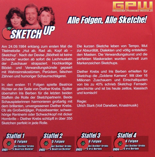 Mit dieser DVD-Box bekommt ihr alle 23 Folgen mit Sketchup – Alle vier Staffeln (Neuauflage) auf DVD vom Studio Hamburg Enterprises ist seit dem 15. August 2014 im Handel erhältlich. Erlebt über 7 Stunden wunderbare Sketche aus den 80er Jahren mit dem unvergessenen Diether Krebs, Iris Berben und Beatrice Richter.
