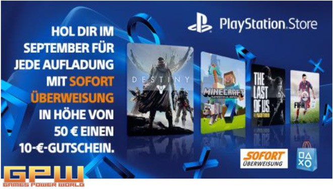 Aufladen und 10€-Gutschein für den PlayStation®Store sichern September-Bonus-Wochen im PlayStation Store Neu-Isenburg, 01. September 2014. Der Herbst mit PlayStation wird heiß: Mit Destiny™ von Activision und FIFA 15™ von Electronic Arts stehen zwei absolute Kracher-Spiele unmittelbar vor dem Release und sind bereits im PlayStation Store vorbestellbar. Pünktlich zur Gaming Hochsaison startet Sony Entertainment Network (SEN) deshalb eine ganz besondere Bonus-Aktion. Einen Monat lang werden Aufladungen des SEN-Kontos, die mindestens 50€ betragen, mit einem satten Bonus belohnt.