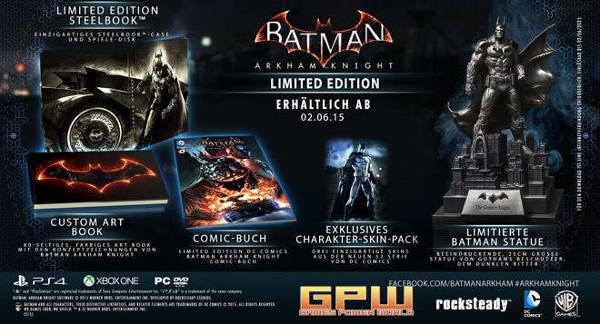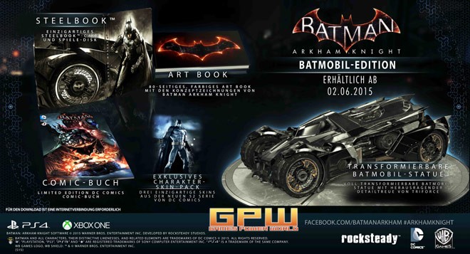 Batman: Arkham Knight - Assets zu den Collectors Editions Warner Bros. Interactive Entertainment und DC Entertainment haben gestern bekanntgegeben, dass Batman™: Arkham Knight weltweit am 2. Juni 2015 erscheint und zeitgleich zwei Collector’s Editions zum Spiel angekündigt. Jetzt steht auch Bildmaterial zu der Batman: Arkham Knight Limited Edition und der Batman: Arkham Knight Batmobil Edition zur Verfügung.
