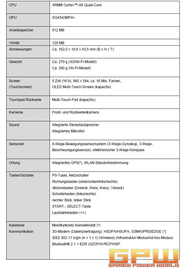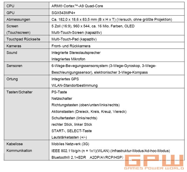 PlayStation Vita – die technischen Details (Angabe vom 16.12.2011):