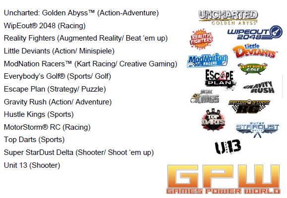 Passend zum Verkaufsstart am 22.02.2012 in Deutschland werden neben komplett neuartigen Titeln, wie Little Deviants und Escape Plan, auch viele der bekanntesten und beliebtesten, PlayStation-exklusiven Franchises auf PS Vita spielbar sein, wie Uncharted™, WipEout® oder MotorStorm®. Das 1st-Party Line-Up beinhaltet: