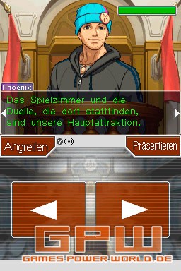 Im zweiten Teil tritt der Spieler dann als Anwalt vor das Gericht: Jetzt geht es darum, den Angeklagten mit Hilfe der gewonnenen Erkenntnisse geschickt zu verteidigen. So nimmt der Spieler etwa die Zeugen ins Kreuzverhör, um die Wahrheit zu aufzudecken. Über das Mikrofon des Nintendo DS kann er stimmgewaltig in die Verhandlung eingreifen, in dem er „Einspruch!“ oder „Moment mal!“ ruft. Wenn der Anwalt daran geht, seine Hypothesen zu belegen, wird auf dem Touchscreen der Tatort dargestellt und er kann die Gegenstände und Spuren antippen, die den Schlüssel zur Wahrheit enthalten. Auch die Gerichtsprotokolle kann der Spieler jederzeit heranziehen, indem er die Profile derjenigen Zeugen anklickt, deren Aussagen neues Licht auf den Fall werfen könnten.