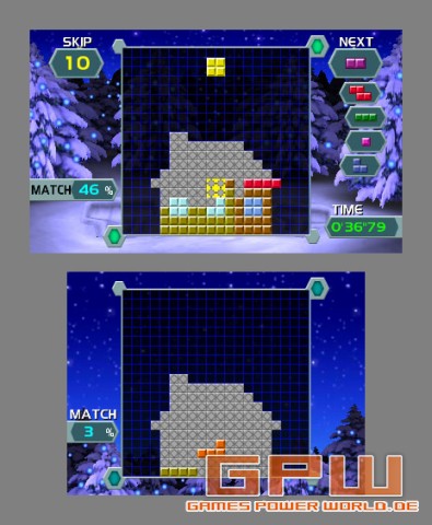 Beschreibung Tetris Jeder, der jemals diesen Klassiker gespielt hat, kennt die dazugehörige, weltberühmte Titelmusik und das großartige Erfolgserlebnis, wenn es gelingt, eine komplette Viererreihe von Tetris-Blöcken mit einem Schlag aufzulösen. Seit über 20 Jahren haben Videospieler aus aller Welt, ob jung oder alt, ihren Spaß daran, unterschiedlich geformte Tetraeder an den passenden Platz zu bugsieren und aufeinander zu stapeln. So wie jetzt haben Sie das Kultspiel aller Puzzle- und Denksport-Fans aber zuvor noch nicht erlebt. Ob allein oder mit weiteren Fans des Nintendo 3DS - dank über 20 verschiedener Spielmodi steht Tetris für zahllose Stunden voller Puzzle-Spaß. Die Spieler können sich in den beliebten Marathon-Modus stürzen oder eine AR-Karte vor sich auf den Tisch legen, um zu erleben, wie dreidimensionale Tetris-Blöcke in die erweiterte Realität purzeln. Weitere spannende Herausforderungen sind unter anderem die Non-Stop-Wettkämpfe im Computer Battle-Modus, der Ausdauertest des Survival-Modus sowie der Fever-Modus, der die Spieler zu einem Wettlauf gegen die Zeit herausfordert. Für letzteren gibt es immer neue, überraschende Items, die automatisch jeder erhält, der die SpotPass™-Funktion des Nintendo 3DS aktiviert und Zugang zu einer drahtlosen Internetverbindung hat. Das Spiel punktet außerdem mit verschiedenen Party-Modi. Ihnen verleiht eine breite Palette brandneuer, kniffliger Tetris-Varianten ihre besondere Würze: In Fit etwa müssen die Spieler Blöcke in speziell geformte Löcher quetschen, in Bombliss Plus dürfen sie Bomben auf aufsteigende Blöcke werfen und in Capture geht es darum, die Steine strategisch so geschickt zu platzieren, dass sie möglichst viele Sterne im Raster verdecken. Und es gibt Jigsaw, in dem man Puzzles zusammensetzen und auch eigene Bilder importieren kann. Nicht zuletzt überrascht Tetris mit jeder Menge Mehrspieler-Optionen. Fünf Spielmodi nutzen die kabellose Kommunikation der Konsole, drei weitere eignen sich für Download-Wettkämpfe, für die nur ein Teilnehmer das Spiel besitzen muss. In diesen Multiplayer-Varianten können sich bis zu acht Tetris-Freunde gemeinsam ins Vergnügen stürzen. Aber damit noch immer nicht genug: Über den World Battle- und den Friend Battle-Modus gehen Fans des Nintendo 3DS online, um sich heiße Wettkämpfe mit Spielern aus aller Herren Länder zu liefern. * Ein Klassiker kehrt in 3D für eine neue Generation zurück und ist in völlig neuer Weise zu erleben. * Inklusive Augmented-Reality-Spielmöglichkeiten und der Option, eigene Bilder zu importieren * Haben Sie über das Lokale Spiel oder Download-Spiel Spaß mit Freunden in der Nähe, kämpfen Sie online über das Internet, und schnappen Sie sich Items über SpotPass! * Vielfältige Spielmodi für Einzelspieler und Tetris-Partys Man kann den 3D-Effekt des Nintendo 3DS nur auf dem System selbst wahrnehmen. Alle Bildschirmfotos und Spielinhalte auf dieser Seite wurden im 2D-Modus aufgenommen. Bildergalerie ![]() ![]() ![]() ![]() Weitere Infos auf G-P-W Artikel: Tetris 3D (28.10.2011) Tetris für Nintendo 3DS - da macht Hochstapelei so richtig Spaß 21.09.2011 - 11:20