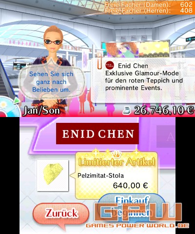 Beschreibung Nintendo präsentiert: New Style Boutique In Kürze wird der Nintendo 3DS mit „Nintendo präsentiert: New Style Boutique“ zum Laufsteg und bietet jedermann die Möglichkeit, den ganz eigenen Stil zu zeigen und sich als Trendsetter der Stadt zu beweisen. Du beginnst das Spiel als Mitarbeiter in einem kleinen Mode-Geschäft. Stetig arbeitest du dich empor, um dich schließlich als Fashion-Ikone und Besitzer deiner eigenen Boutique auf Modenschauen zu behaupten und Trends für die ganze Stadt zu setzen. Als Spieler musst du dein ganzes modisches Gespür beweisen, wenn Kunden mit unterschiedlichen Vorlieben deinen Laden betreten und um deinen kreativen Rat bitten. Wer die Besucher genau beobachtet, kann anhand ihrer Persönlichkeit und der Kleidung, die sie tragen, den individuellen Stil erahnen. Dann gilt es, aus über 12.000 verschiedenen Kleidungsstücken und Accessoires Outfits zusammenzustellen, die genau den Kundengeschmack treffen. Hierfür finden sich Kleidungsstücke zahlreicher Marken, Accessoires und erstmals auch Handtaschen und Herrenmode im Sortiment. Somit stellt „Nintendo präsentiert: New Style Boutique sowohl dein modisches Gespür auf den Prüfstand, als auch deine Fähigkeit, einen Laden zu führen und deine Bestände zu verwalten. Je zufriedener die Kunden, umso mehr Bereiche der Stadt werden freigeschaltet und können von erkundet werden – dann erhältst du Zugang zu Orten wie dem Hairstylisten oder dem Fotoatelier. Du kannst sogar ausgehen und dabei Figuren aus dem Spiel treffen – vorausgesetzt dein voller Terminkalender lässt dies zu. Damit das Spiel wie maßgeschneidert zum Modegeschmack der europäischen Style-Experten passt, ist Nintendo of Europe eine Partnerschaft mit einer pariser Mode-Agentur eingegangen, die exklusive Outfits für „Nintendo präsentiert: New Style Boutique“ entworfen hat. Modeliebhaber können sich außerdem darüber freuen, dass im Verlauf des Spiels Figuren auftauchen, die Ensembles tragen, die zur gerade aktuellen Jahreszeit passen. Vielleicht können diese als zusätzliche Inspiration dienen? Die besonderen Funktionen des Nintendo 3DS kommen voll zum Einsatz: So können Spieler etwa brandneue Stücke für ihre Garderobe herunterladen. Zudem ermöglicht StreetPass das Tauschen von Visitenkarten mit anderen Spielern, sodass diese Bekanntschaften später, auf der Suche nach einem neuen Outfit, in deiner Boutique auftauchen können. Und nicht nur das: Die Spieler können jederzeit untereinander ihre jeweiligen Online-Shops besuchen. Sobald ein Spieler das nächste Mal das Spiel startet, sieht er, ob die Kleidungsstücke jemandem gefallen haben und ob vielleicht sogar etwas gekauft wurde. Wer einen Eindruck davon bekommen möchte, wie sein Outfit wohl im wahren Leben aussehen würde, kann mithilfe der Augmented-Reality-Funktionen bis zu zwei seiner besonders gut gekleideten Charaktere aus dem Spiel in der Realität „erscheinen“ lassen und diesen Augenblick für die Ewigkeit festhalten. Mit Nintendo 3DS-Kamera kann das Bild sogar noch nachträglich bearbeitet und ein ganz eigenes Flair hinzugefügt werden. Und das ist noch nicht alles, denn im Modus „Style-Check“ können die Spieler ihre eigenen Styles bewerten lassen: Sie erstellen dazu ein Outfit, das dann in sechs Einzelkategorien beurteilt wird und eine Gesamtbewertung erhält. Eine tolle Möglichkeit, den eigenen Modegeschmack mit dem der Freunde zu vergleichen! Für die Besitzer eines Nintendo 3DS gibt es eine spezielle Demo, die „New Style Boutique: Shopping Experience“. Damit kann jeder einen Schaufensterbummel durch das virtuelle Fashion-Viertel machen. Die Shops der Spieler laden zum Stöbern ein, und es steht sogar ein begrenztes, virtuelles Budget für ein paar Einkäufe zur Verfügung. Selbstverständlich lassen sich diese Einkäufe später in die Vollversion übertragen! Zufriedene Kunden im Spiel und Bewertungen von realen Personen sind dann für die Spieler ein Ansporn, sich beim Fashion-Contest zu beweisen. Sie suchen sich ein Model aus, gestalten ein Outfit und stylen Haare und Make-Up. Danach geht es für das Model auf den Catwalk. Bei erfolgreichen Shows winken Preise wie seltene Kleidungsstücke oder Accessoires sowie die Möglichkeit, sich bei noch prestigeträchtigeren Wettbewerben zu messen. Nur, wer hartnäckig und gut genug ist, kann beim Elite-Contest gegen die Besten der Besten auf dem Laufsteg antreten! In Kürze können sich die Besitzer eines Nintendo 3DS oder Nintendo 3DS XL in die Glitzerwelt der Fashion stürzen und Ihr Modegespür unter Beweis stellen. „Nintendo präsentiert: New Style Boutique“ wird sowohl in einer Einzelhandels-Version als auch zum Download via Nintendo eShop verfügbar sein. Auf der Modemesse decken Boutiquen-Besitzer sich mit Schnäppchen ein – aber sie müssen sicherstellen, dass bei hoher Nachfrage die richtigen Artikel vorrätig sind, um die Nase vorn zu haben! Man kann den 3D-Effekt des Nintendo 3DS nur auf dem System selbst wahrnehmen. Alle Bildschirmfotos und Spielinhalte auf dieser Seite wurden im 2D-Modus aufgenommen. Bildergalerie ![]() ![]() ![]() ![]() Weitere Infos auf G-P-W Artikel: Nintendo präsentiert: New Style Boutique (18.11.2012) Nintendo präsentiert: New Style Boutique - Testbericht 18.11.2012 - 13:00