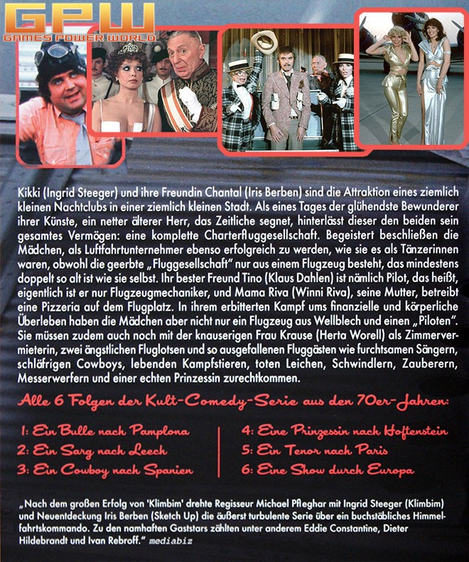 Zwei himmlische Töchter Euro Video zeigt mit dieser DVD-Box alle sechs Folgen der Kult-Comedy-Serie aus den 70ern mit Ingrid Steeger und Iris Berben als Stewardessen ihrer geerbten Charterfluglinie „Donnerflug“. Die Serie Zwei himmlische Töchter wurden in Deutschland das erste Mal vom 11. Februar 1978 bis 20. Mai 1978 in der ARD ausgestrahlt. Und seit dem 11. November 2016 ist auch die Vorgänger Kult-Comedy-Serie Klimbim komplett auf 8 DVD´s durch Fernsehjuwelen im Handel erhältlich.