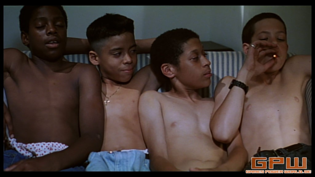 Später trifft sich Telly mit seinem Freund Caspar. Sie kaufen sich Dope mit Geld, das sie gerade Tellys Mutter geklaut haben. Total bekifft, verprügeln sie einen Schwarzen, der Caspar versehentlich angerempelt hat.