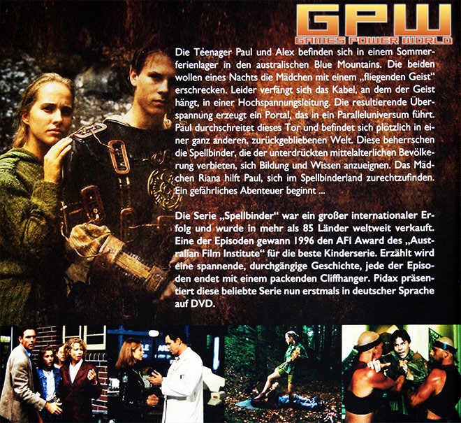 Spellbinder - Gefangen in der Vergangenheit, Vol. 1 Spellbinder - Gefangen in der Vergangenheit, Vol. 1, wird durch Pidax am 10. Februar 2017 in der Reihe Pidax Serien-Klassiker auf 2 DVDs veröffentlicht und ist somit erstmals auf DVD auch in Deutschland erhältlich. Alle 26 Folgen von Spellbinder - Gefangen in der Vergangenheit waren bei uns in Deutschland das erste Mal ab 06. Oktober 1997 bis 10. November 1997 im ZDF Kinderkanal zu sehen. Von Spellbinder gibt es auch eine zweite Staffel mit weiteren 26 Folgen unter dem Namen Spellbinder – Im Land des Drachenkaisers, diese ist aber im Prinzip eine eigenständige Serie für sich. Die erste Hälfte von Spellbinder - Gefangen in der Vergangenheit spielt in der Welt von Riana und die zweite überwiegend in der Welt von Paul.