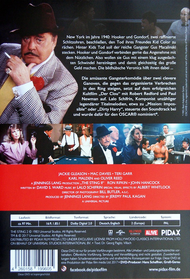 Zwei ausgekochte Gauner (The Sting II) der Film von 1983, die Fortsetzung des Kinohits "Der Clou" auf DVD Zwei ausgekochte Gauner (The Sting II) auf DVD von Pidax ist ab heute (14. Juli ... Zwei ausgekochte Gauner von 1983 ab 14. Juli auf DVD erhältlich 04.07.2017 - 19:48