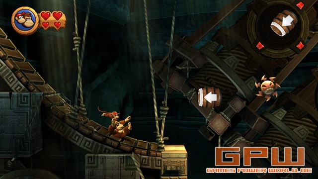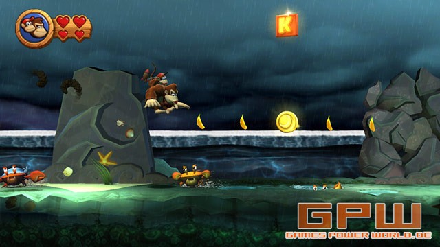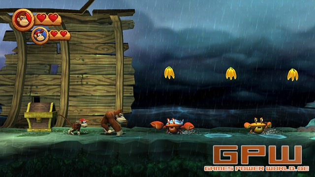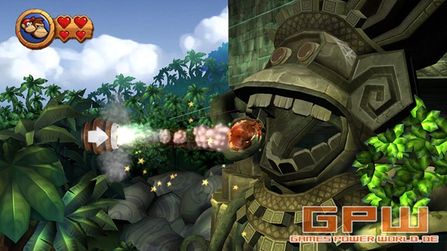 Donkey Kong Country Returns Nintendo baut auf sein Franchise. Nicht nur Mario, Link und Samus Aran bekommen immer neue Teile, die uns begeistern, sondern auch Donkey Kong. Er hat einen weiten Weg hinter sich, vom Bösewicht im Arcade-Game „Mario vs. Donkey“. Auf dem SNES haben die 3 Teile von Donkey Kong Country viele Spieler zu Recht begeistert. Ein Jump ‚n‘ Run at it’s best. Was macht ein gutes Jump ‚n‘ Run aus? Sprungpassagen, die gerade so schwer sind, dass man tierisch von sich beeindruckt ist, sie bewältigt zu haben. Viele Items zum Sammeln und ein paar Sachen hinzuzukaufen. Dazu sehr abwechslungsreiche Welten mit packenden Bosskämpfen. Lasst euch gesagt sein, es ist alles dabei! Wie so oft, wird Donkey im Schlaf um all seine Bananen gebracht. Kaum bemerkt ihr den Schaden, kommt auch gleich eine skurrile Holzpuppe, die auch euch versucht zu hypnotisieren. Zu ärgerlich, dass es bei Donkey Kong jedoch nicht funktioniert und die Holzpuppe erstmal tüchtig prügel bezieht. Sogleich macht ihr euch auf den Weg durch den Dschungel, den Strand, Ruinen, Höhlen, den Wald und mehrere Gebiete. In jeder Welt gibt es immer noch einen besonderen Weg, den ihr euch mit Bananenmünzen beim alten Cranky Kong erkaufen könnt. Die Münzen findet ihr überall in den Levels verteilt oder wenn ihr ohne Bodenkontakt mehr als zwei Gegnern auf den Kopf springt. Natürlich findet ihr auch ungefähr eine Milliarde Bananen. Jeweils 100 bringen euch ein neues Leben (manch einer sieht den ersten Zusammenhang zu Mario und anderen Jump ‚n‘ Runs..) in Form eines Ballons, an dem ihr nach einem Fehlsprung wieder zurück ins Level segelt. Dazu solltet ihr natürlich auch immer auf der Suche nach den K-O-N-G-Buchstaben und mehreren Puzzleteilen, die in jedem Level versteckt sind. Manche könnt ihr gar nicht verfehlen, bei anderen ist einiges an Kreativität und Spitzfindigkeit von Nöten. Wie man es aus Donkey Kong-Spielen gewohnt ist, gibt es jede Menge knifflige Situationen, die einiges an Frustrationspotential haben. Selbst wenn man zeitweise mal mehr als 50 Leben auf seinem Konto hat, ist die nächste große Hürde nicht weit entfernt. Dadurch, dass man immer viele Bananen und Bananenmünzen findet, ist sehr befriedigend für alle Sammler. Ihr werdet sie auch brauchen, um genug Leben zu sammeln und ggf. bei Cranky Kong nachzukaufen. Natürlich müsst ihr euch nicht alleine durchschlagen. Das typische „DK“-Fass ist auch wieder mit dabei und da drin wartet Diddy Kong. Spielt ihr alleine, schwingt er sich auf euren Rücken. Ihr erhaltet zu euren zwei Herzen, zwei weitere durch Diddy Kong und könnt mehr Treffer durch Gegner einstecken. Verliert Diddy seine zwei Herzen, verschwindet er wieder. In der Zwischenzeit reitet er auf eurem Rücken und lässt euch mit seinem Fassjetpack ein wenig schweben. Dadurch könnt ihr genauer und weiter springen. Im 2-Spieler Modus steigt Diddy dann auch mal von Donkey ab und wird von einem Freund gesteuert. Dann hat Diddy sogar noch eine Erdnusspistole, um Gegner zu betäuben. Insofern hat es eurer Mitspieler eigentlich sogar besser als ihr, weil Diddy zwei weitere Fähigkeiten hat (Erdnusspistole und Jetpack zum Schweben). Auch sonst hat der 2-Spieler-Modus sehr viele Ähnlichkeiten zu dem von New Super Mario Bros.. Verliert ein Mitspieler ein Leben, kann er auf Knopfdruck zurück ins Level schweben und durch Schütteln der Wii-Mote zum Mitspieler, der ihn berühren muss um ihn freizulassen. Sterben beide gleichzeitig, müsst ihr den Level wieder neu beginnen. Es gibt natürlich auch wieder ein paar tierische Helfer, doch auch neue Transportmittel. Sehr geschickt gemacht ist das Reiten auf dem Raketenfass. Wie der Helikopter-Klassiker unter den Browsergames, steigt ihr durch das Drücken des A-Knopfes und sinkt, wenn ihr nicht mehr drückt. Die Raketenfasslevel sind einige der kniffligsten. Scheitert ihr sehr oft, könnt ihr „Super Kong“ rufen, der für euch den Level durchspielt, während ihr zuguckt. Dabei erhaltet ihr keinerlei Items und der Level gilt auch nicht als geschafft. Dennoch könnt ihr den folgenden Level so angehen und steckt nicht an einer einzigen Stelle fest. Zuzugucken, wie der Computer den Level spielt, hilft aber nur bedingt, weil es selten daran scheitert, dass man nicht weiß, wie es weitergeht, sondern die Sprünge nicht richtig timen kann. Sound: Steuerung: Test von: