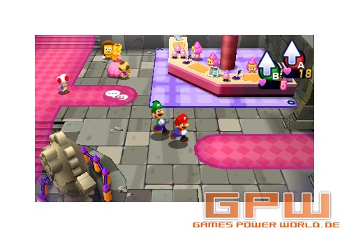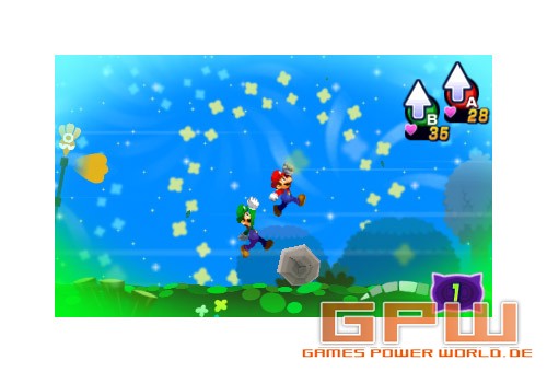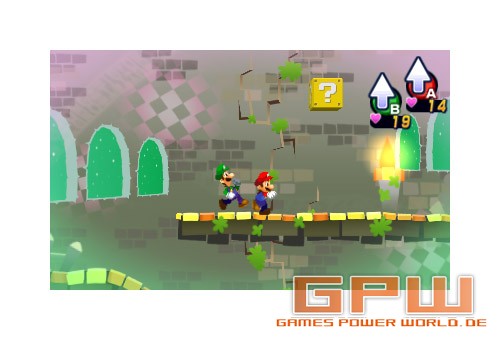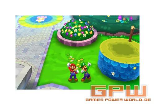 Ihr seid verwirrt? Nicht zum letzten Mal. Es geht auch gleich ähnlich skurril weiter: In einem Willkommensquiz müsst ihr Fragen mit „Ja“ oder „Nein“ beantworten, die so schwer sind, wie die Fragen im deutschen Abendprogramm. Nach all der Freundlichkeit dürft ihr euch noch ein wenig umsehen, ehe eure Gastgeber dann doch ihr zunächst wahres Gesicht zeigen: Die klötzigen Bösewichte wollen euch zum Abendessen verspeisen! Aber wird das wirklich die endgültige wahre Bedrohung sein? Eine Frage, die ihr euch öfter stellen werdet. Um aber zunächst nicht als Festmahl zu enden, geht es in die rundenbasierten Kämpfe. Grundsätzlich ist dieses System für Mario-Spiele untypisch, schließlich lauft ihr sonst mit mehr Freiheit durch die Gegend. Aber auch hier funktioniert die spätestens aus Pokemon oder Final Fantasy bekannte Mechanik gut. Ihr müsst noch immer Sprünge genau timen, aber halt nicht mehr selber lenken. Dazu sammelt ihr, wie in einem klassischen Rollenspiel, Erfahrungspunkte nach jedem Kampf und könnt im Level aufsteigen und so stärker werden. Auch gibt es Items, die ihr vor, während oder nach dem Kampf einsetzen könnt. Neue Ausrüstung darf auch nicht fehlen, ihr erwerbt sie im Laufe des Spiels von euren gesammelten Münzen. Dazu gehören neue Schuhe oder Latzhosen. Das Besondere an diesem Spiel ist, dass ihr Mario und Luigi gleichzeitig steuert. Dabei habt ihr mehr das Gefühl, dass ihr Mario bewegt, weil er quasi vorläuft, während ihm Luigi folgt. Jeder der beiden hat jedoch eine eigene Sprungtaste. Mit dem A-Knopf hüpft Mario und mit dem B-Knopf Luigi. Dies bringt eine Vielzahl an Geschicklichkeitsaufgaben und Sprungpassagen mit sich. Alles wirkt dabei aber ziemlich intuitiv und macht Lust auf mehr.