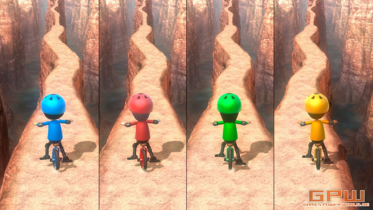Auf schmalem Grad: Auf einem Einrad müsst ihr einen dünnen Pfad überqueren. Hier ist Balancegefühl gefragt. Ihr müsst eure WiiMote stets so neigen, dass ihr nicht in den Abgrund stürzt. Nichts für schwache Nerven und Spieler mit Höhenangst.