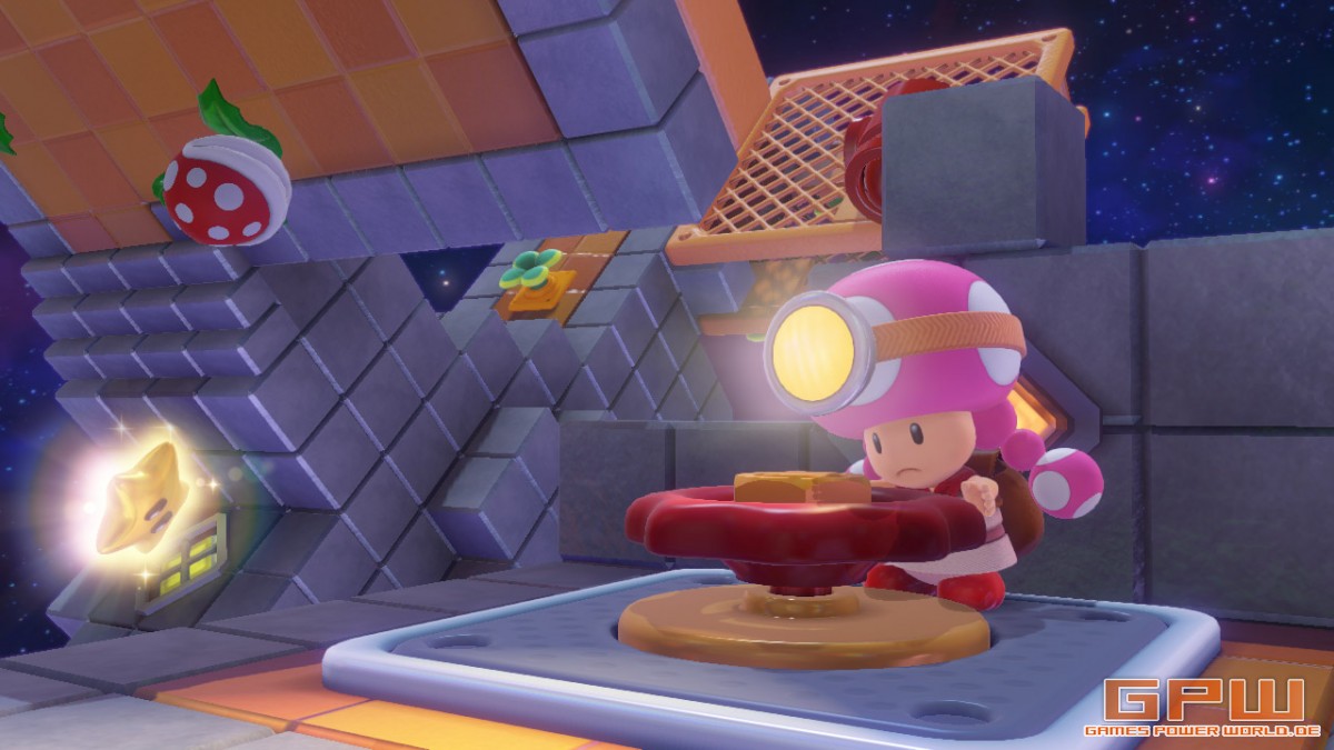 Nachdem die Minispiele mit Toad in Super Mario 3D World wohl großen Anklang gefunden haben, gibt es nun ein „stand alone“-Spiel für den allseits beliebten Pilz. Wer noch nicht mit dem Spielprinzip vertraut ist, wird sich dennoch schnell zurecht finden. Jedes Level findet auf einem im freien Raum schwebenden Würfel (mehr oder weniger symmetrisch) statt. Ziel des Spiels ist es, den Stern einzusammeln, der regelmäßig am Ende des Levels auf euch wartet. Der Weg dorthin ist durch viele Rätsel und Labyrinthe gezeichnet, die ihr bewältigen müsst. Ihr könnt mit dem rechten Joystick die Welt rotieren, mit dem X-Knopf zoomt ihr heran und habt so die Kamera stets selber gut im Griff. Mit dem linken Joystick bewegt ihr Toad. Mit dem A-Knopf könnt ihr mit eurer Umgebung interagieren, beispielsweise Dinge aus dem Boden pflücken.