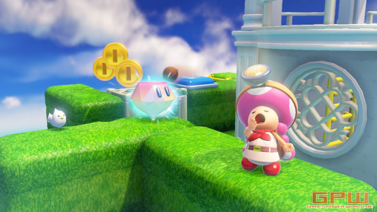 Das Spiel beginnt auch direkt mit dem ersten Level, das allerdings noch keinerlei wirkliche Hürden bereithält. Doch kaum habt ihr den ersten Stern gefunden, kommt ein großer Vogel, der sowohl Toadette, als auch den schönen Stern vor Toads Augen entführt. Das war es dann auch erst mal an Geschichte. Ob sich „Treasure“ aus dem Titel „Captain Toad - Treasure Hunter“ nun auf Toadette oder die Sterne bezieht, bleibt offen. Wahrscheinlich auf beide.