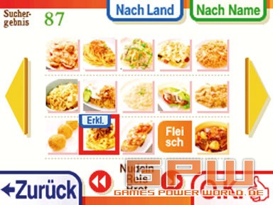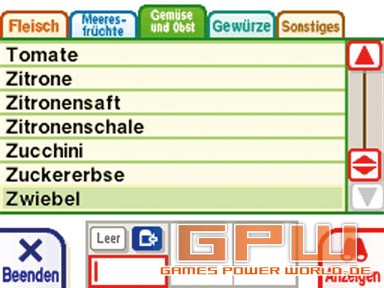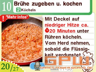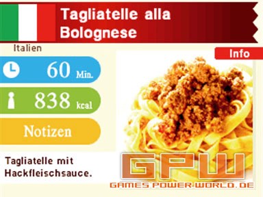 Viele Menschen essen gerne, nicht alle haben jedoch ein Händchen fürs Kochen. Das soll mit „Kochkurs™ - Was wollen wir heute kochen?“ nun besser werden! Der DS hat ja schon viele Funktionen gezeigt. So gab es nicht nur normale Jump’n’Runs, Musik- oder Partyspiele, sondern machte aus uns Gehirnjogger, brachte uns Englisch bei oder ersetzte den Sudoku-Block. Ein weiteres Kapitel Funktionalität wird aufgeschlagen: Der DS ersetzt das Kochbuch! Insgesamt stehen euch 245 verschiedene Rezepte zur Verfügung. Ausnahmsweise bereits von Beginn an. Zwar gibt es einen Kalender an dem festgehalten wird, an welchem Tag ihr den Schneebesen geschwungen habt, doch hat dies keinerlei Einfluss auf den Umfang und die Anzahl der Rezepte. Die Rezepte verteilen sich gleichmäßig auf die Bereiche Salat, Suppen, Nudeln/Reis/Brot, Fleisch, Fisch, Gemüse, Sonstiges/Beilagen und Dessert. Wer sich nicht entscheiden kann, dem hilft ein praktisches Filtersystem. So kann nach ländertypischen Gerichten gesucht werden, nach Schwierigkeitsgrad, Hauptzutat, Dauer oder sogar der Kalorienzahl für die gewichtsbewussten Kocher. Hat man sich für ein Gericht entschieden, beispielsweise italienisches Carpaccio, welches 15 Minuten Zubereitung benötigt und 576 kcal beinhaltet, kann man sich Einsicht in die Zutaten und Arbeitsschritte verschaffen. Bei den Zutaten kann eingestellt werden, ob für 1, 2, 4 oder gar 6 Personen gekocht werden soll. Sämtliche Zutaten, die nicht zu Hause vorzufinden sind, können markiert werden und finden sich umgehend in der DS-internen Einkaufsliste wieder. Jede Zutat ist beschrieben und abgebildet, so dass auch Männer und Kinder sie problemlos im Supermarkt finden können. Darüber hinaus wird auch eine Utensilienübersicht geboten, so dass man nicht erst nach einer halben Stunde kochen merkt, dass man keinen Fleischklopfer hat. Glücklicherweise sind in solchen Fällen jedoch zumeist auch Alternativen angegeben. Nun geht es im wahrsten Sinne des Wortes, an’s Eingemachte. Schritt für Schritt nimmt das Mahl, unter Angaben des freundlichen Koch, Form an. Viele Schritte sind mit einem besonderen Tipp, teilweise sogar in Videoform, verdeutlicht. Hat man einen Teil absolviert, kann man entweder auf den DS-Touchscreen drücken oder einfach „Weiter“ sagen. Hat man etwas vergessen, genügt ein einfaches „Wiederholen“. Die Spracherkennung über das Mikro funktioniert dabei sehr gut, solange nicht zu viele Umgebungsgeräusche vorhanden sind. Je nach Erfahrung variieren natürlich noch immer Zubereitungszeit und Geschmackserlebnis, doch nur wer übt, der lernt. Sound: Steuerung: Test von: